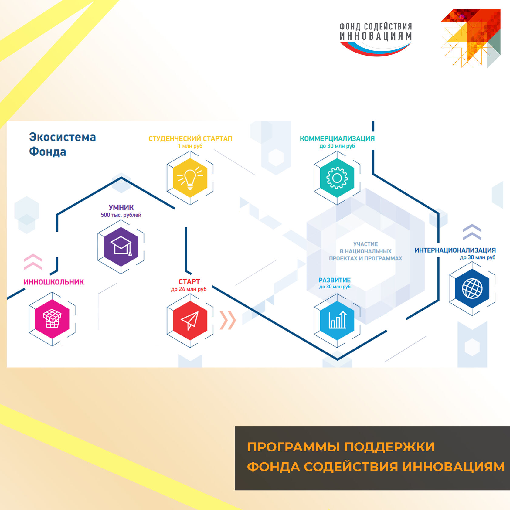Фонд содействия инновациям предоставляет набор программ поддержки, которые охватывают весь жизненный цикл проекта: от идеи, придуманной в школе или университете, до выхода на рынок и масштабирования производства инновационной продукции.