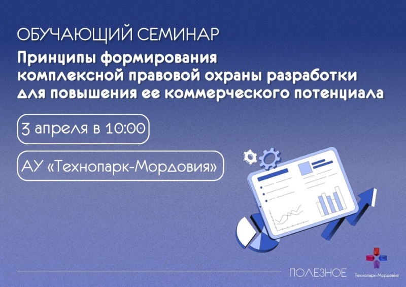 АУ «Технопарк-Мордовия» информирует о том, что 3 апреля 2025 г. состоится обучающий семинар «Принципы формирования комплексной правовой охраны разработки для повышения ее коммерческого потенциала». Организаторы семинара: Евразийское патентное ведомство (ЕАПВ), Министерство промышленности, науки и новых технологий Республики Мордовия, АУ «Технопарк-Мордовия», ФГБОУ ВО «МГУ им. Н.П. Огарёва».